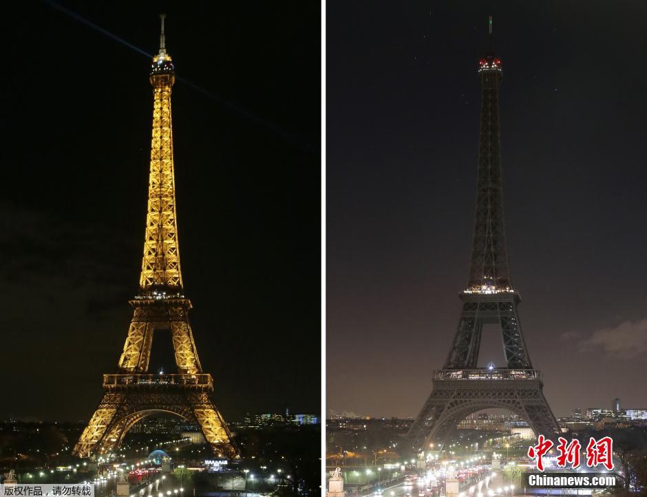 A 20h00 heure locale, les lumières de la Tour Eiffel ont été éteintes pendant un moment, en signe d'hommage et de deuil.