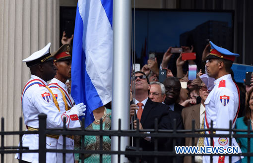 WASHINGTON, 20 juillet (Xinhua) -- Ce lundi, Cuba a fait flotter son drapeau devant son ambassade nouvellement rouverte à Washington, étape symbolique qui fait suite à la décision de Cuba et des Etats-Unis de renouer leurs relations diplomatiques après un demi-siècle de rupture.