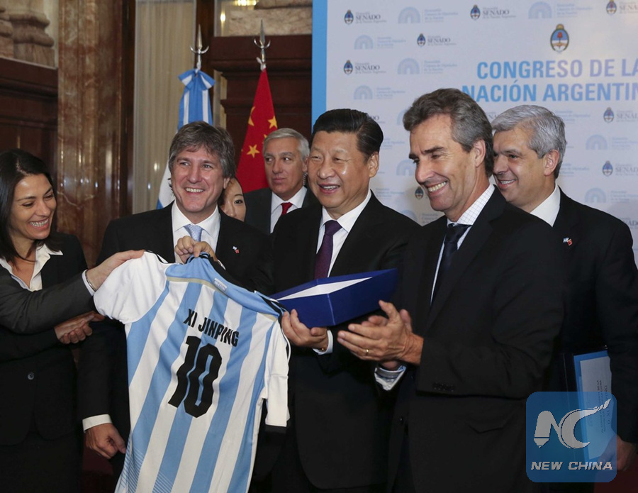 Le présdient chinois Xi Jinping (G3) reçoit un maillot de No. 10 de l'équipe nationale argentine à Buenos Aries le 19 juillet, 2014. (Photo : Xinhua/Ding Lin)