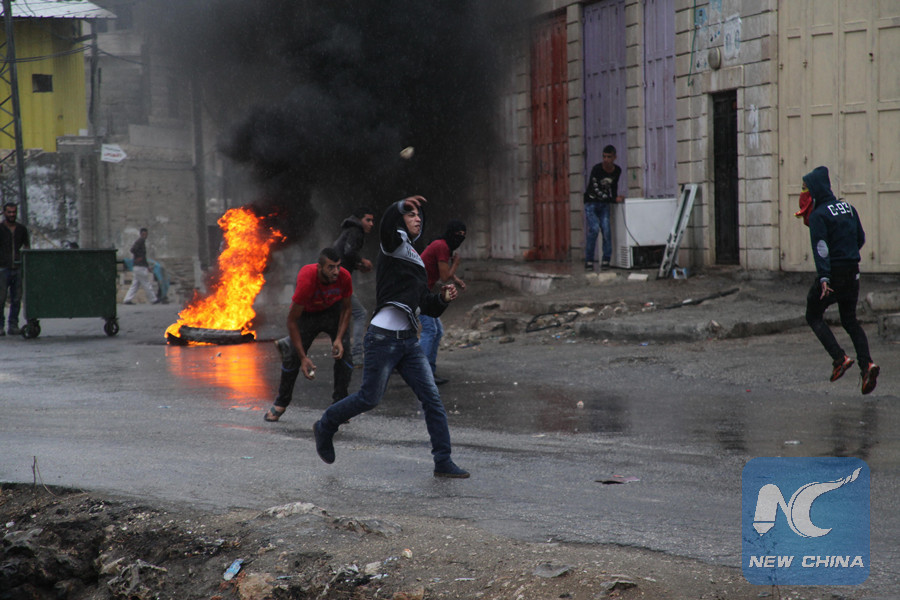 Des Palestiniens lancent des pierres sur les soldats israéliens au village de Si'eer au nord de Hébron en Cisjordanie le 25 octobre 2015. (Xinhua Photo)