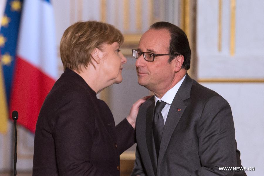 PARIS, 25 novembre (Xinhua) -- Après s'être entretenu la veille avec Barack Obama à Washington, le chef de l'Etat français François Hollande a rencontré ce mercredi à Paris la chancelière allemande Angela Merkel pour évoquer l'accueil des réfugiés en Europe et la lutte contre le terrorisme.