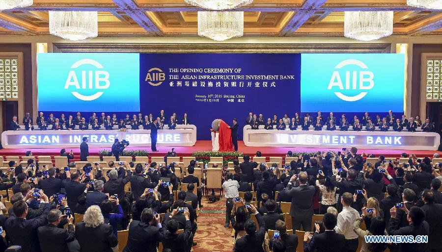 Le président chinois Xi Jinping dévoile une sculpture symbolique lors de la cérémonie d'inauguration de la Banque asiatique d'investissement pour les infrastructures (BAII), le 16 janvier 2016 à Beijing. (Xinhua/Xie Huanchi)