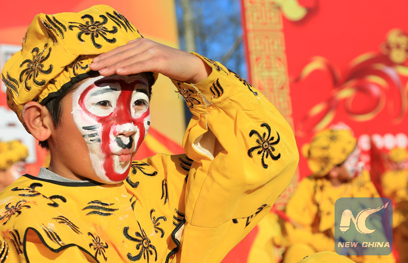Un enfant habillé en Roi des Singes pour un spectacle lors d'une foire de l'art dans le district de Huairou à Beijing, capitale de la Chine, le 1er février 2016, à l'occasion de l'Année du Singe qui débutera le 8 février. (photo: Xinhua/Bu Xiangdong)