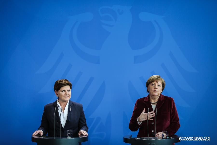 La chancelière allemande Angela Merkel (D) et la Première ministre polonaise Beata Szydlo, lors d'une conférence de presse, vendredi 12 février à Berlin, capitale allemande. (Xinhua/Zhang Fan)