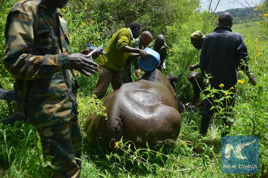 Le personnel du KWS entaille l'oreille d'un rhino dans le Parc national de Lake Nakuru le 4 juin 2015, ce qui permet d'identifier les animaux. (Xinhua/Sheikh Maina)