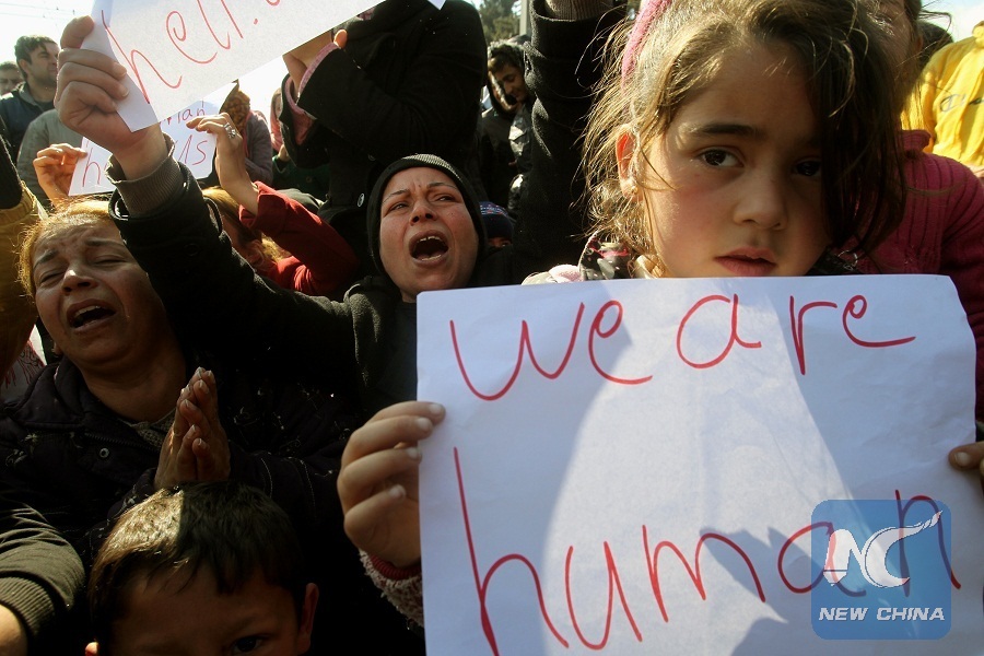 Des réfugiés syriens bloquent le chemin de fer en Macédoine pour protester contre l'ouverture erratique de la frontière, le 3 mars 2016. (Xinhua/Marios Lolos)