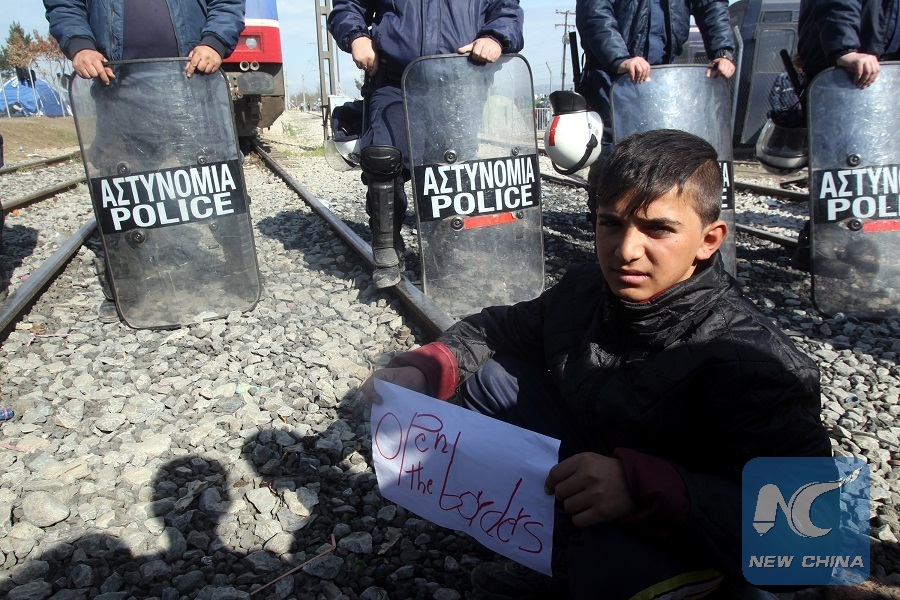 "Ouvrez la frontière", peut-on lire sur le papier tenu par le garçon qui manifeste sur le chemin de fer en Macédoine contre l'ouverture erratique de la frontière, le 3 mars 2016. (Xinhua/Marios Lolos)