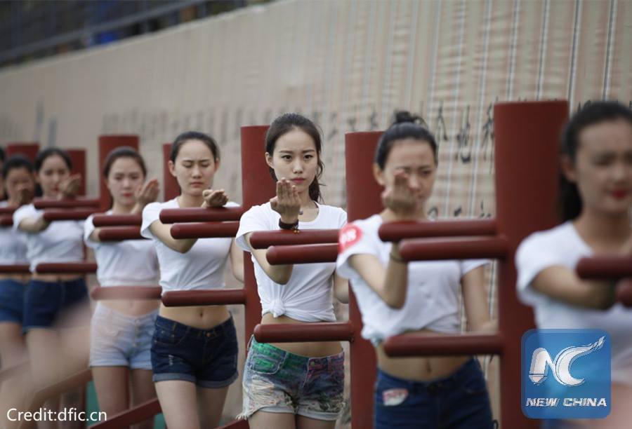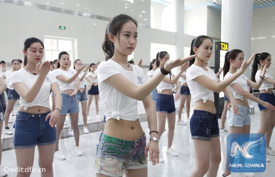 Dans le Sichuan, plus de 100 candidates hôtesses de l'air apprenaient l'art martial chinois du wing chun pour l'auto-défense et ont appelé les gens à se comporter vertueusement lorsqu'un crime a lieu.