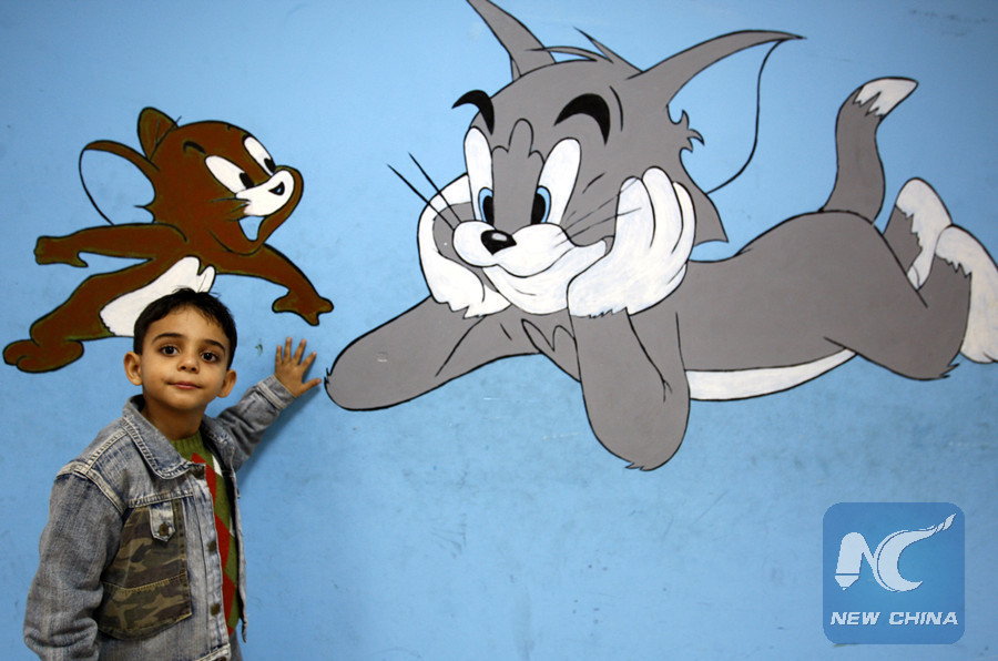 Un enfant palestinien se trouve près d'un graffiti de Tom et Jerry, dans la ville de Gaza, le 7 novembre 2010. (Photo : Xinhua/Wissam Nassar)