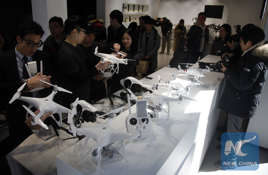 Des employés du principal fabricant chinois de drones DJI montrent le Phantom 4, le dernier caméra quadcopter (ou "drone") introduit par DJI dans le magasin phare de DJI à Séoul, capitale sud-coréenne, le 11 mars 2016. (Photo : Xinhua/Yao Qilin)