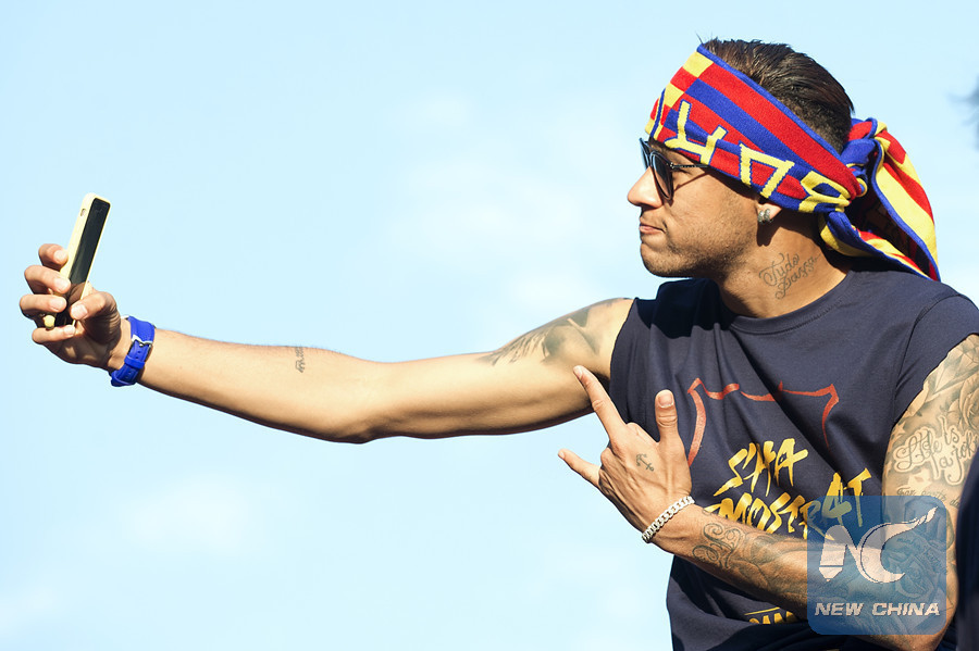 Le footballeur international brésilien Neymar se prend en selfie en attendant la parade du FC Barcelone qui a remporté La Liga, le championnat espagnol, à Barcelone en Espagne, le 15 mai 2016. (Xinhua/Lino De Vallier)