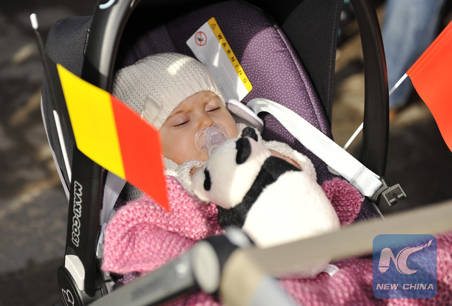 Un bébé dort avec son jouet panda alors que des gens attendent l'arrivée de pandas géants à Pairi Daiza, seul zoo en Belgique, situé à 60 km au sud-ouest de Bruxelles, le 23 février 2014. (Xinhua/Ye Pingfan)