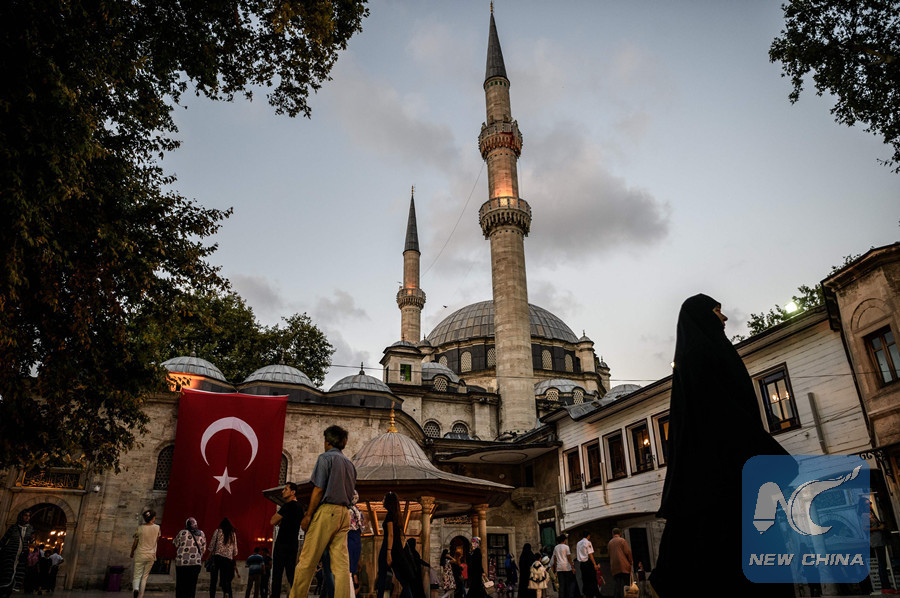 Un drapeau national turc pendu à la mosquée Eyup Sultan à Istanbul en Turquie le 26 juillet 2016. (Photo: Xinhua/AFP)