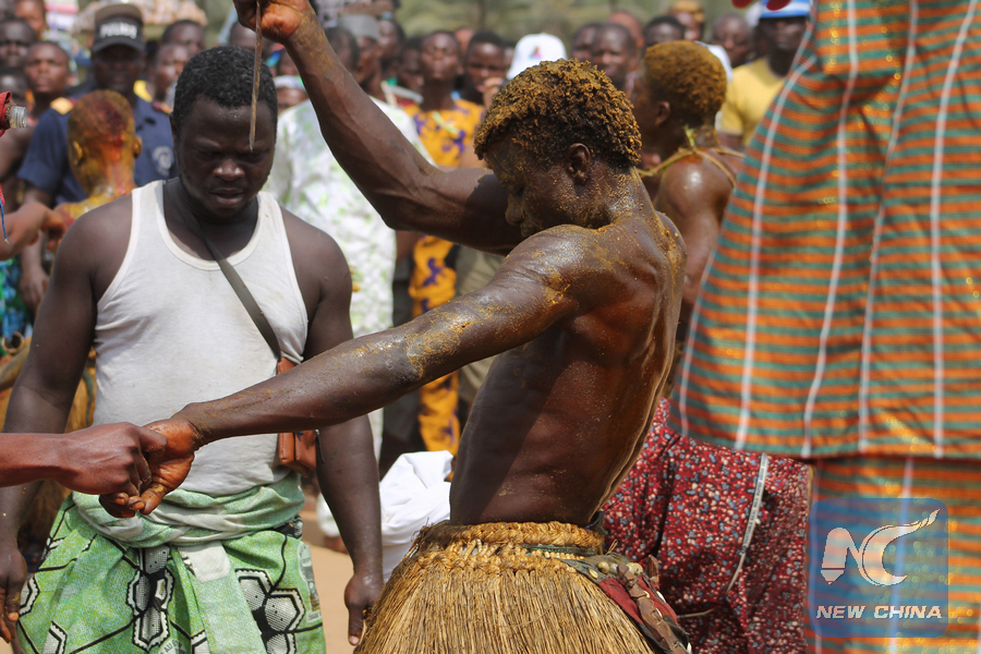Des adeptes de vodoun célèbrent les divinités du culte vodoun, à Ouidah, au Bénin, le 10 janvier 2017. (Xinhua/Seraphin Zounyekpe)