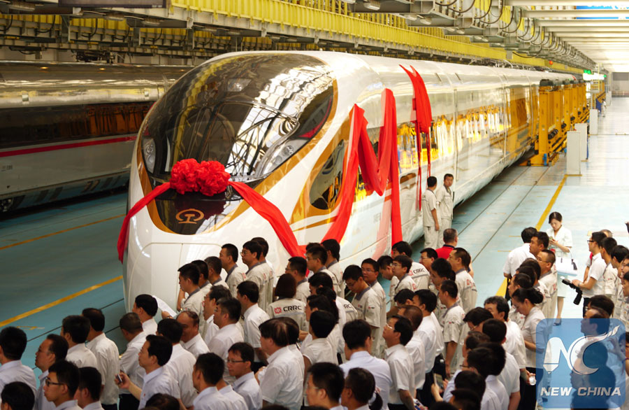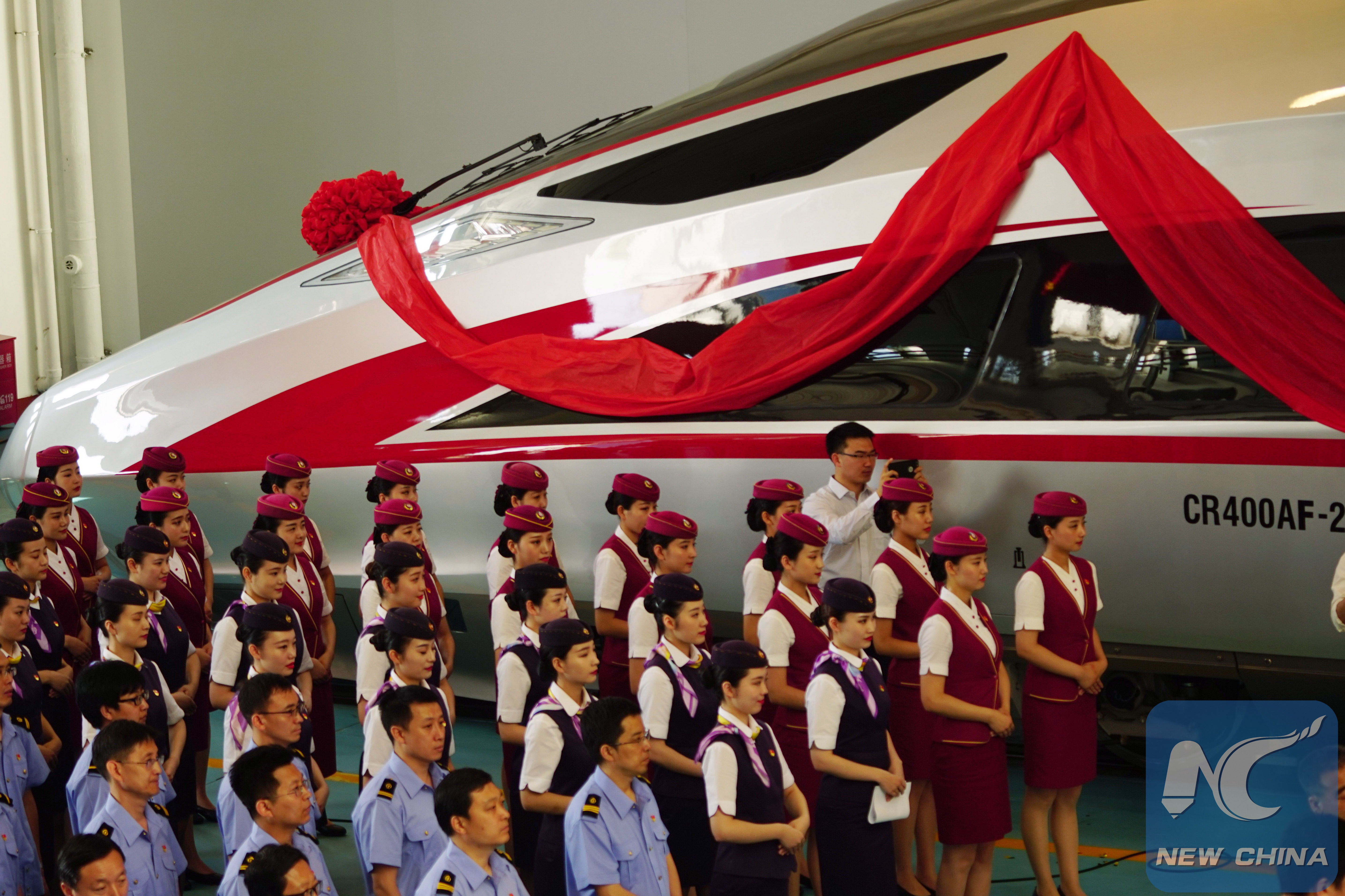 Inauguration du modèle CR400BF du nouveau TGV chinois Fuxing qui reliera Beijing et Shanghai, à Beijing le 25 juin 2017 (Photo Xinhua/Ju Huanzong)