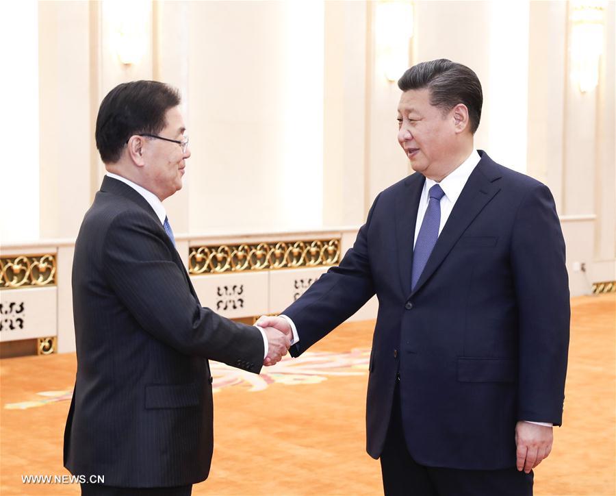 BEIJING, 12 mars (Xinhua) -- Le président chinois Xi Jinping a rencontré lundi à Beijing Chung Eui-Yong, le conseiller à la sécurité nationale du président de la République de Corée, Moon Jae-in.