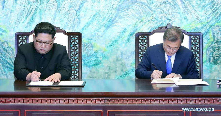 GOYANG (Corée du Sud), 27 avril (Xinhua) -- Le président de la Corée du Sud, Moon Jae-in, et Kim Jong Un, dirigeant suprême de la République populaire démocratique de Corée (RPDC), ont signé vendredi une déclaration conjointe confirmant leur objectif commun de parvenir à une dénucléarisation complète de la péninsule coréenne, après leur rencontre dans le village frontalier de Panmunjom.