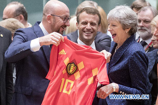BRUXELLES, 29 juin (Xinhua) -- Le Premier ministre belge, Charles Michel (à gauche), offre un maillot de l'équipe de football belge à la Première ministre britannique, Theresa May, en présence du président français, Emmanuel Macron, lors du premier des deux jours d'un sommet de l'UE, à Bruxelles, en Belgique, le 28 juin 2018. (Photo : Thierry Monass)