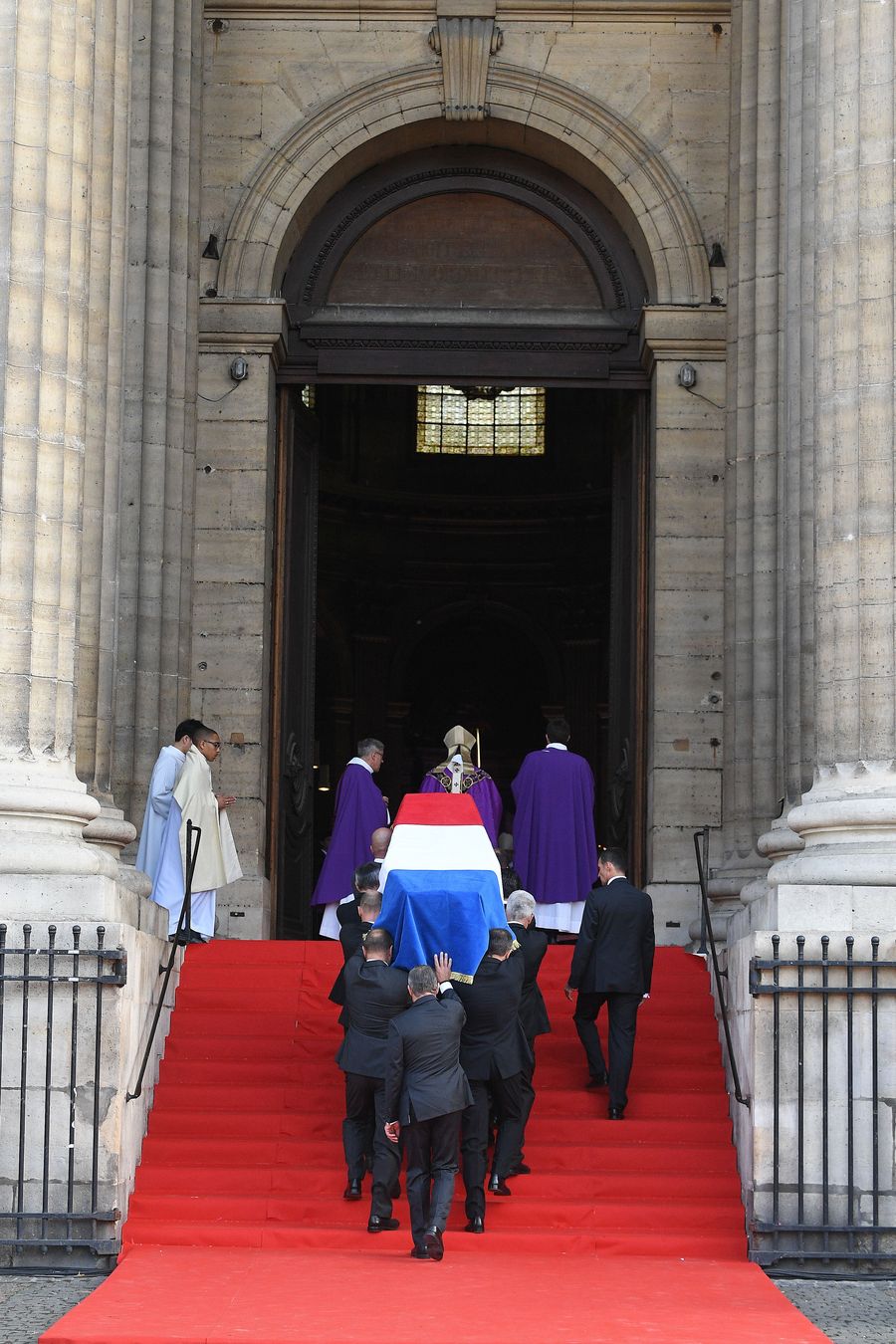 Enveloppé du drapeau français, le cercueil de Jacques Chirac a été porté le long de la nef de Saint-Sulpice au son du requiem de Gabriel Fauré, porté par ses anciens officiers de sécurité de l'Elysée. Le président Macron était présent avec son épouse Brigitte, ainsi que les anciens chefs d'Etat français Valéry Giscard d'Estaing, Nicolas Sarkozy et François Hollande, mais aussi de hauts dirigeants étrangers proches de Jacques Chirac dont le président russe Vladimir Poutine, le président congolais Denis Sassou-Nguesso ou encore l'ancien président américain Bill Clinton.
