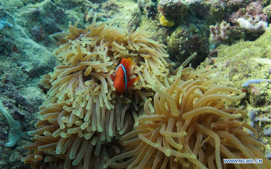 LINGSHUI, 5 octobre (Xinhua) -- Un poisson-clown nageant autour d'anémones de mer, à Boundary Island Tourist Attraction, dans le district de Lingshui de la province chinoise de Hainan (sud), le 4 octobre 2019. (Photo : Yang Guanyu)