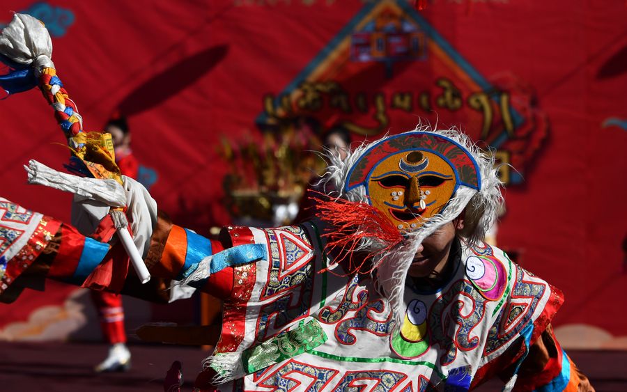 Un acteur lors d'une représentation d'opéra tibétain dans l'arrondissement de Doilungdeqen, à Lhassa, dans la région autonome du Tibet (sud-ouest de la Chine), le 25 janvier 2020. (Photo : Chogo)