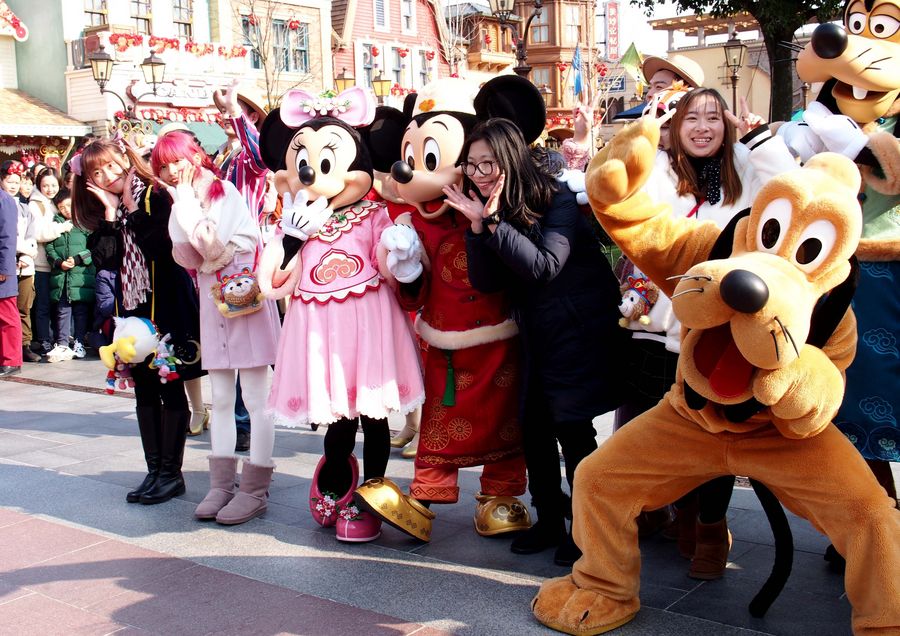Des touristes posent pour des photos avec des personnages de Disney à Shanghai Disneyland, à Shanghai, dans l'est de la Chine, le 21 janvier 2019. (Photo : Ren Long)