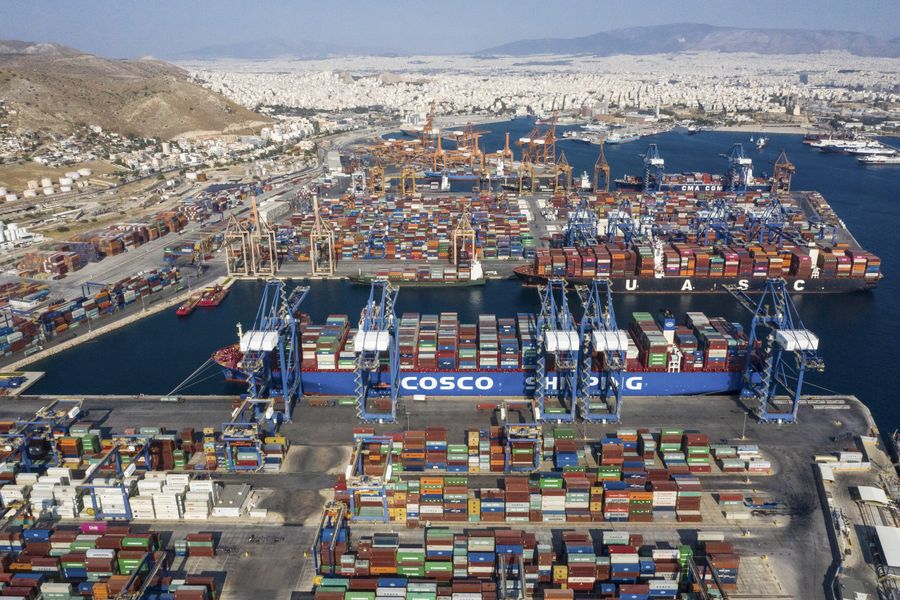 Vue aérienne prise le 6 septembre 2019 montre un cargo de COSCOSHIPPING Lines dans le port du Pirée en Grèce. (Xinhua/Lefteris Partsalis)