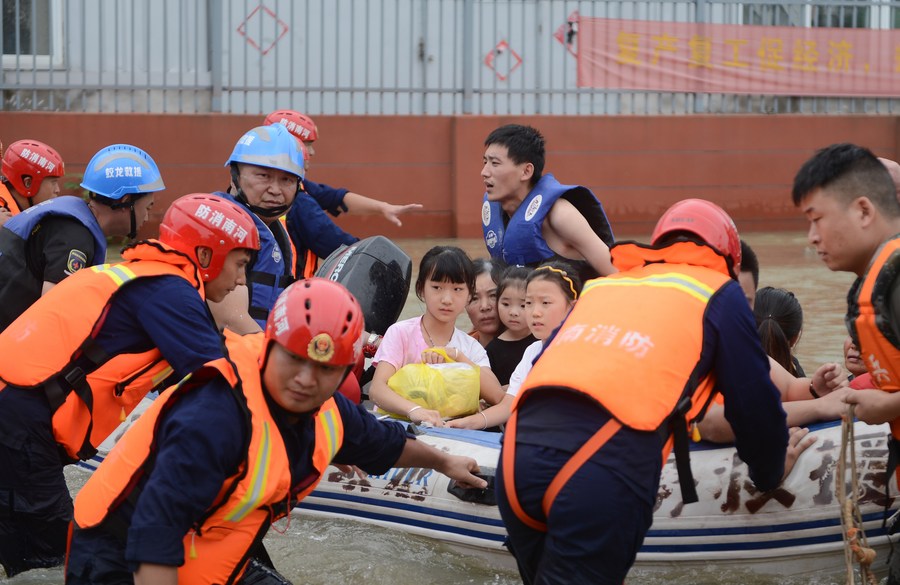 Des gens affectés par les inondations transportés par un canot de secours dans le bourg de Guzhen, dans l'arrondissement de Yu'an de la ville de Lu'an, dans la province chinoise de l'Anhui (est), le 20 juillet 2020. (Photo : Han Xiaoyu)