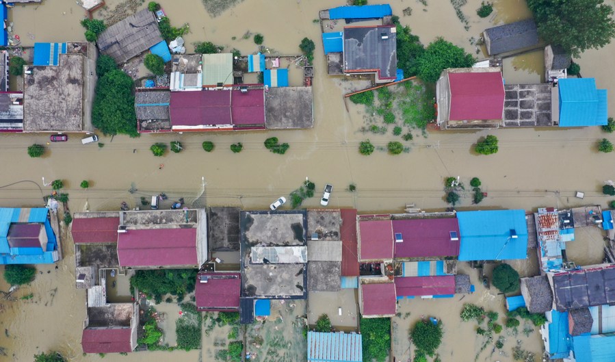 Photo aérienne des inondations dans le bourg de Guzhen, dans l'arrondissement de Yu'an de la ville de Lu'an, dans la province chinoise de l'Anhui (est), le 20 juillet 2020. (Photo : Tang Yang)