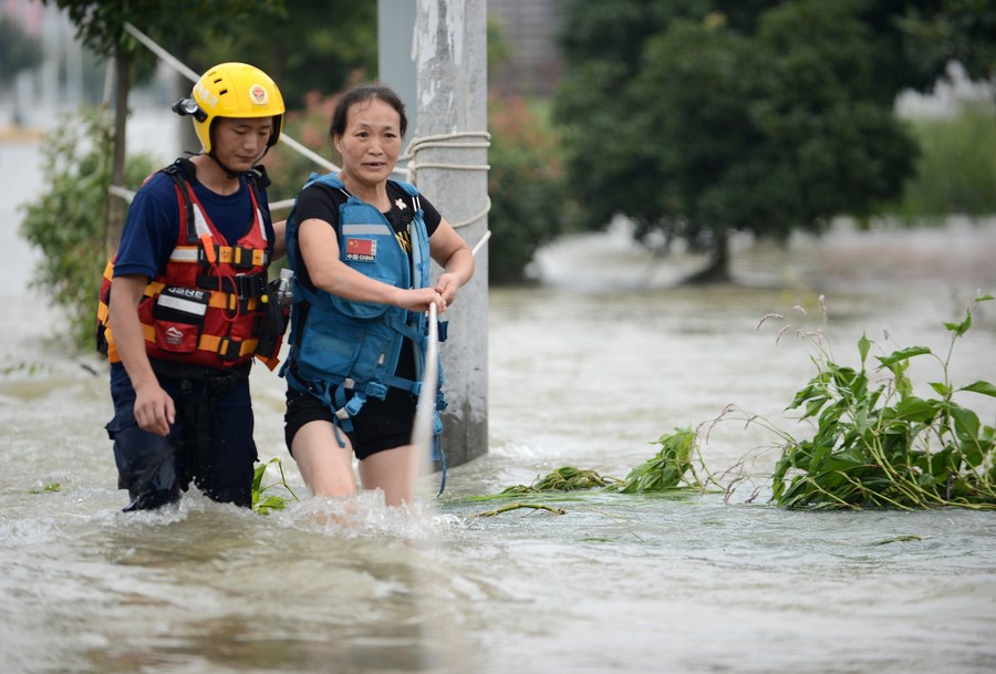 Une femme traverse l'eau à l'aide d'un secouriste dans le bourg de Guzhen, dans l'arrondissement de Yu'an de la ville de Lu'an, dans la province chinoise de l'Anhui (est), le 20 juillet 2020. (Photo : Han Xiaoyu)