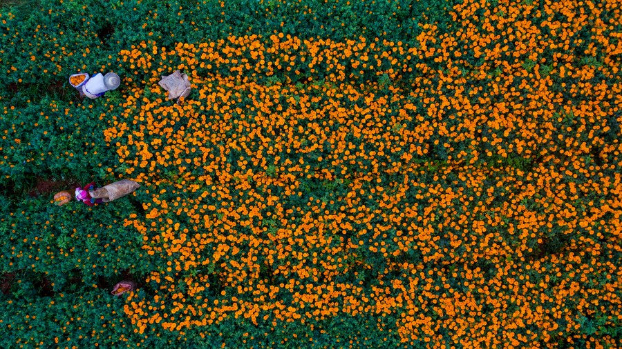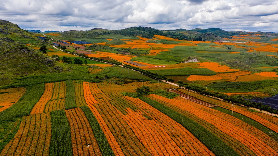 Photo aérienne de champs de fleurs de souci dans le district de Qiubei de la province chinoise du Yunnan (sud-ouest), le 13 août 2020. (Photo : Hu Chao)