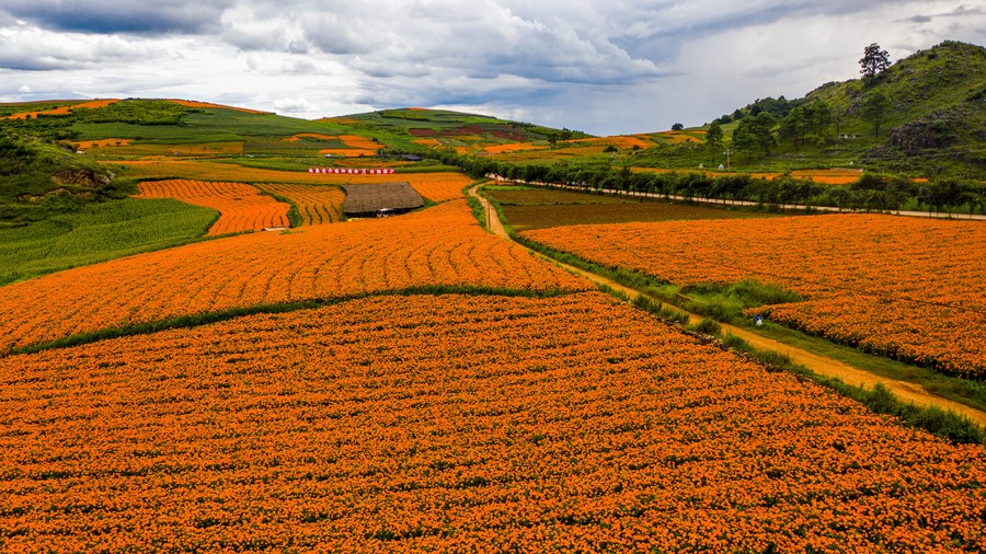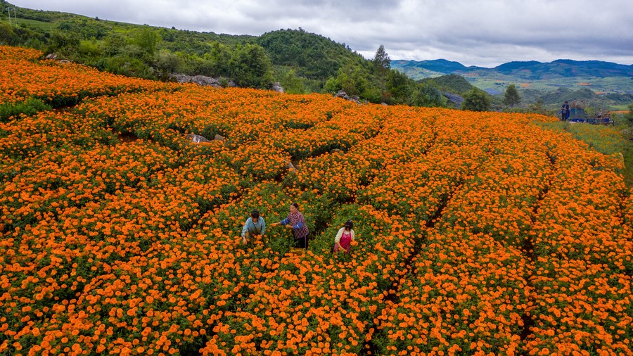 QIUBEI, 14 août (Xinhua) -- Couvrant une zone de 103.000 mu (environ 6.867 hectares), la culture du souci a bénéficié à un total de 13.000 foyers locaux en leur apportant une hausse du revenu moyen de 12.000 yuans (environ 1.727 dollars) par foyer.