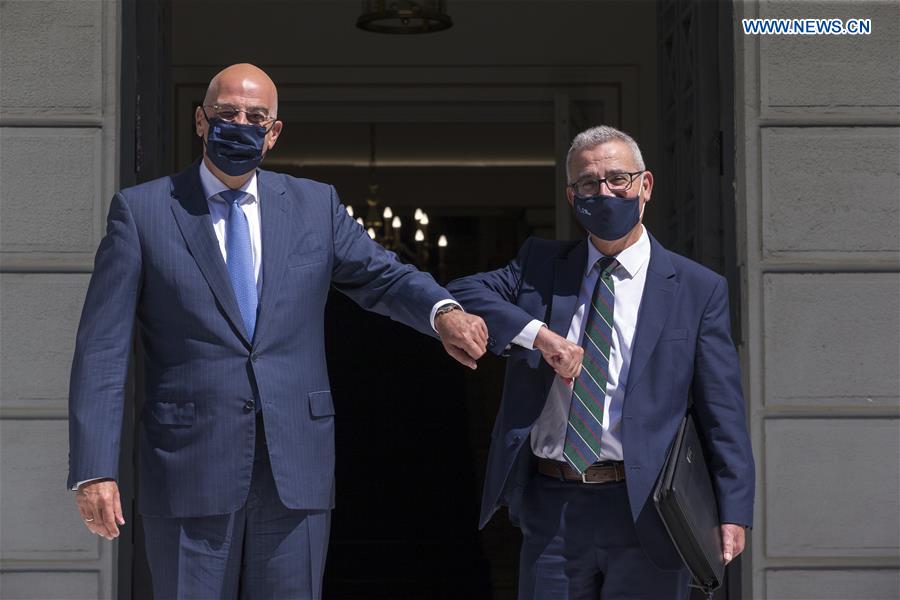 Le ministre grec des Affaires étrangères Nikos Dendias (G) rencontre le ministre maltais des affaires étrangères Evarist Bartolo à Athènes, en Grèce, le 7 septembre 2020. (Xinhua/Marios Lolos)