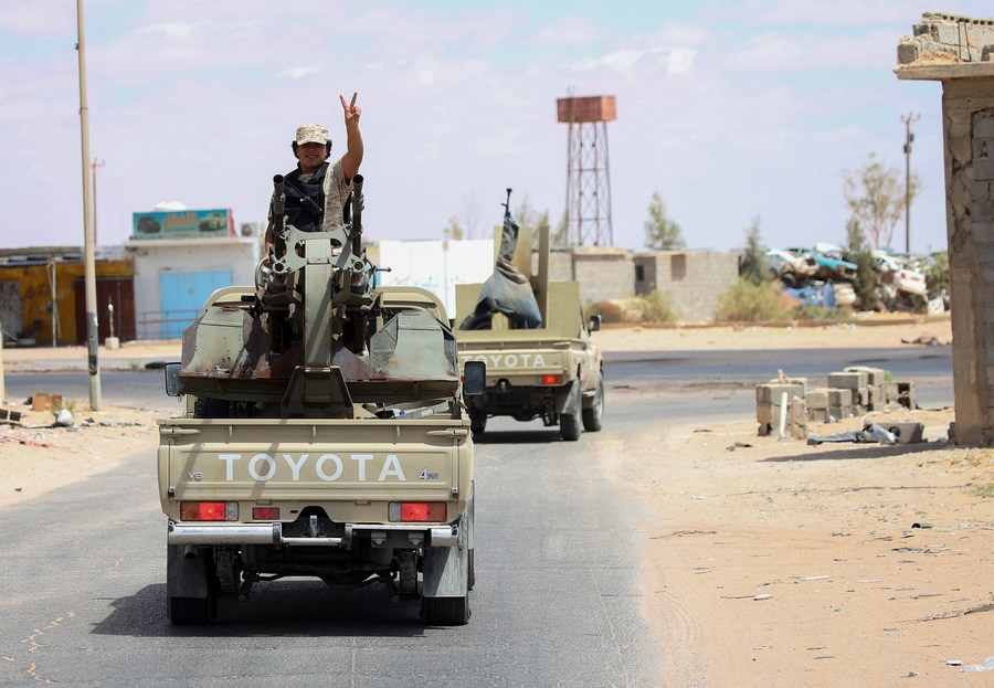Un combattant du gouvernement libyen reconnu par l'ONU à bord d'une camionnette dans la région d'Abou Qurain, à 300km à l'est de Tripoli, capitale de la Libye, le 20 juillet 2020. (Xinhua/Hamza Turkia)