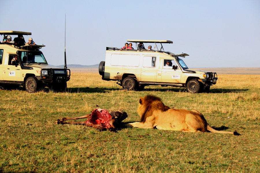 Des touristes regardent un lion alors qu'il profite de son repas dans la Réserve nationale du Masai Mara, au Kenya, le 19 septembre 2020. (Xinhua/Nyalwash)