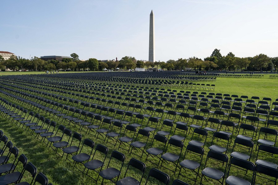 Des chaises vides sont installées pour pleurer les morts aux Etats-Unis à cause du COVID-19 près de la Maison Blanche à Washington DC, le 4 octobre 2020 (Xinhua / Liu Jie)