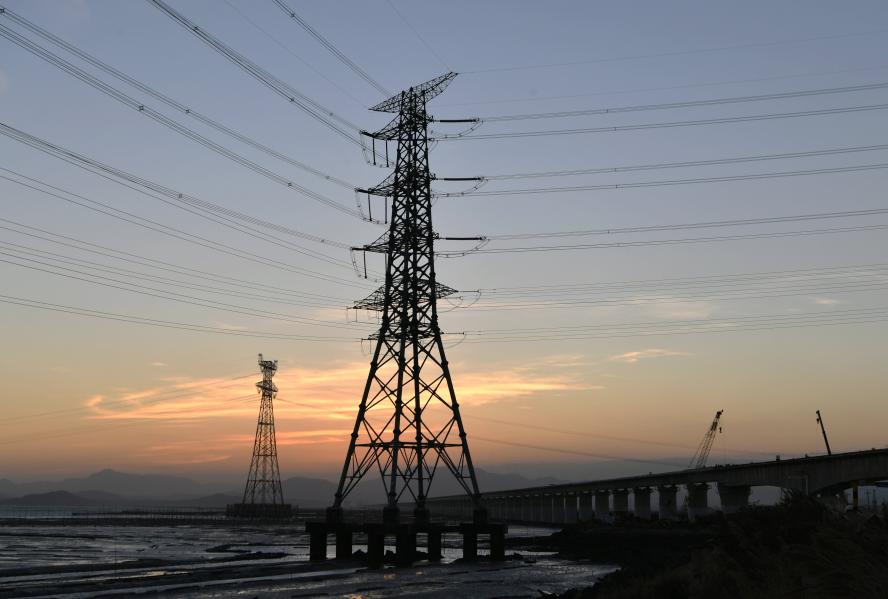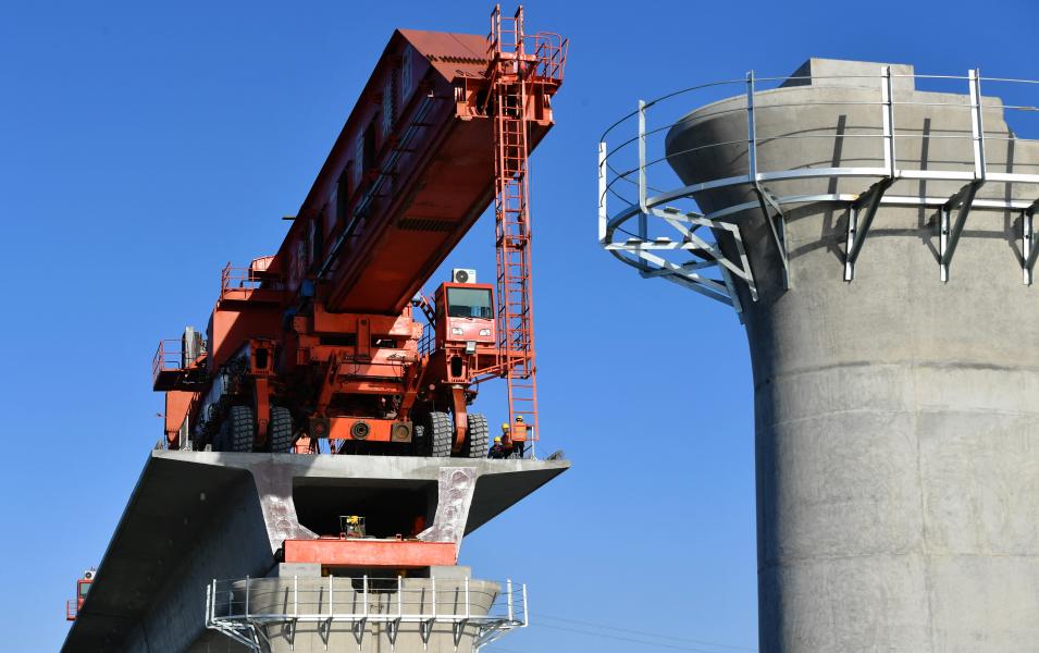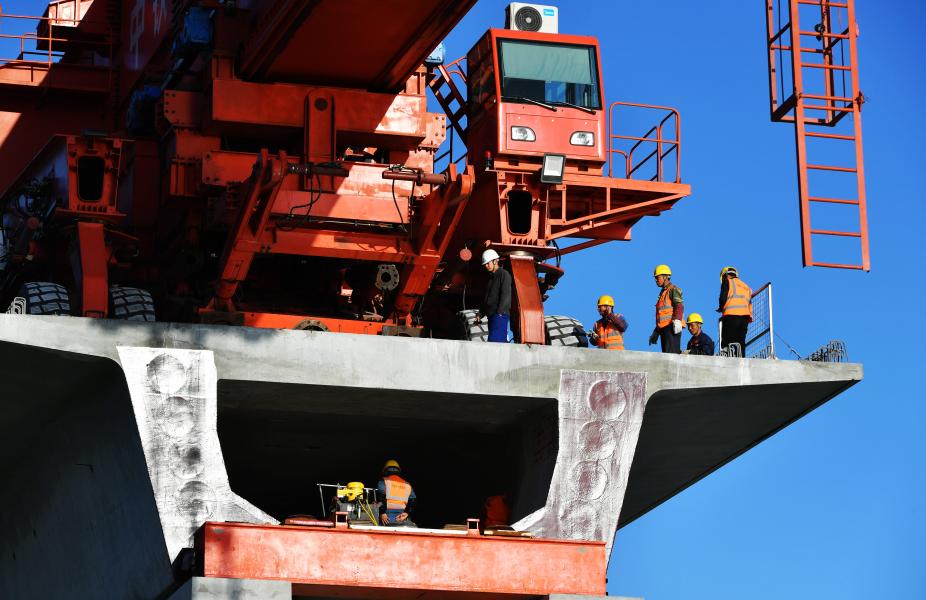 Des ouvriers travaillent sur le chantier du pont de la baie de Meizhou du chemin de fer à grande vitesse Fuzhou-Xiamen, dans la province chinoise du Fujian, le 2 décembre 2020. (Photo : Wei Peiquan)