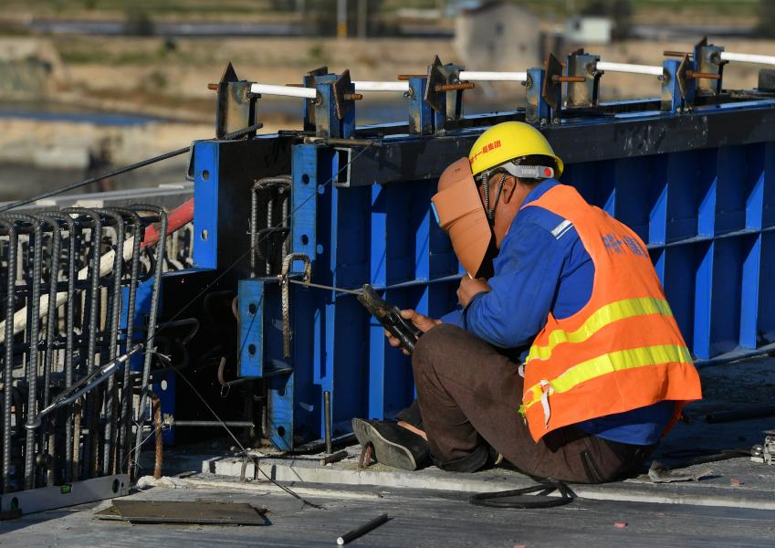 Un ouvrier travaille sur le chantier du pont de la baie de Meizhou du chemin de fer à grande vitesse Fuzhou-Xiamen, dans la province chinoise du Fujian, le 2 décembre 2020. (Photo : Wei Peiquan)