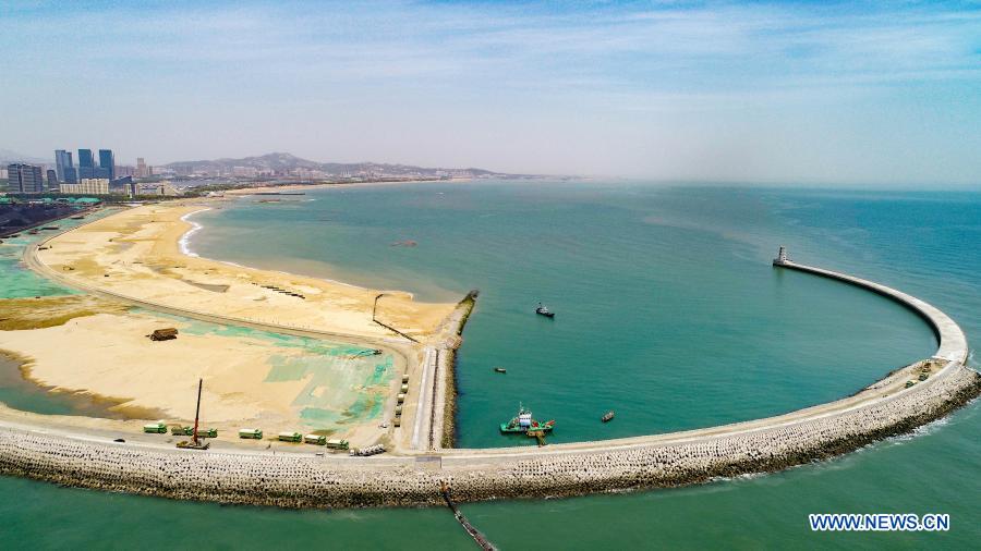 Photo aérienne prise le 6 mai 2019 montrant une partie de la zone libérée dans le port de Rizhao, dans la province chinoise du Shandong (est). (Photo fournie par le port de Rizhao)