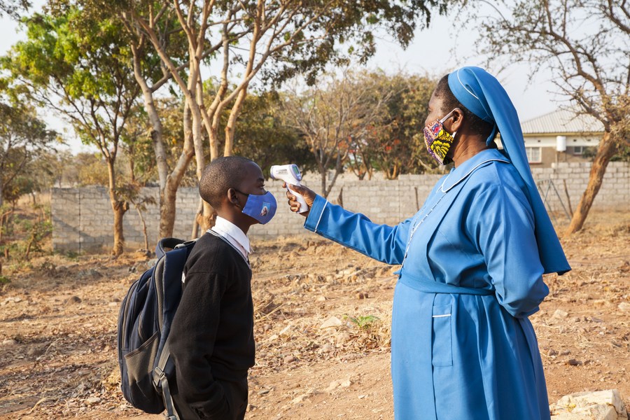 Une enseignante prend la température d'un élève d'une école dans la capitale zambienne, Lusaka, le 21 septembre 2020. (Photo : Martin Mbangweta/Xinhua)