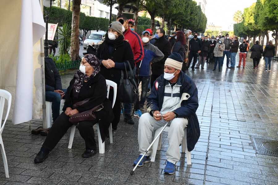 Des citoyens font la queue pour un test de COVID-19 gratuit dans le centre-ville de Tunis, en Tunisie, le 21 décembre 2020. (Xinhua/Adel Ezzine)