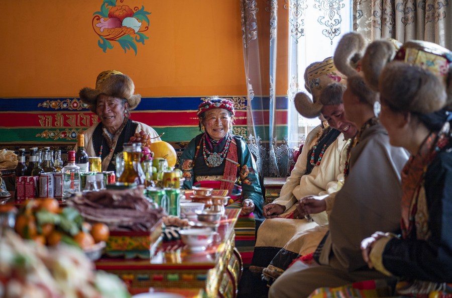 Des villageois réinstallés d'une zone pauvre fêtent le Nouvel An tibétain des agriculteurs dans leur nouvelle maison, à Gajilin, un village du district de Sa'gya à Xigaze, dans la région autonome du Tibet (sud-ouest de la Chine), le 14 janvier 2021. (Photo : Sun Fei)