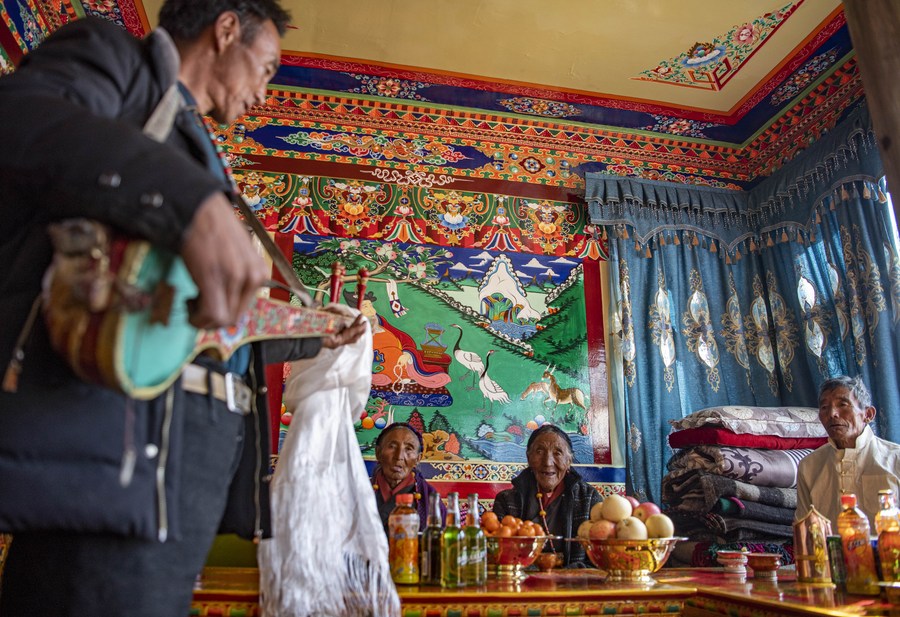 Un villageois réinstallé d'une zone pauvre joue du dranyen pour fêter le Nouvel An tibétain des agriculteurs dans sa nouvelle maison, à Gajilin, un village du district de Sa'gya à Xigaze, dans la région autonome du Tibet (sud-ouest de la Chine), le 14 janvier 2021. (Photo : Sun Fei)