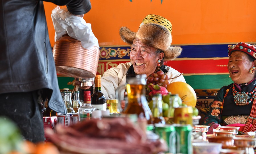 Des villageois réinstallés d'une zone pauvre fêtent le Nouvel An tibétain des agriculteurs dans leur nouvelle maison, à Gajilin, un village du district de Sa'gya à Xigaze, dans la région autonome du Tibet (sud-ouest de la Chine), le 14 janvier 2021. (Photo : Sun Fei)■