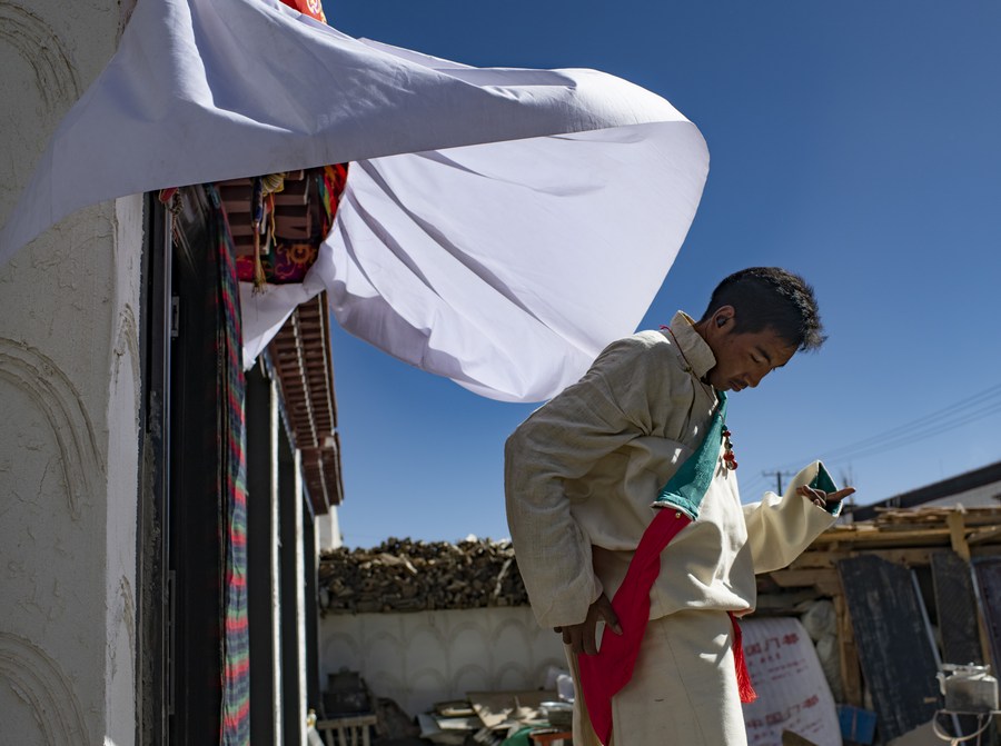 Un villageois réinstallé d'une zone pauvre met des vêtements neufs pour fêter le Nouvel An tibétain des agriculteurs dans sa nouvelle maison, à Gajilin, un village du district de Sa'gya à Xigaze, dans la région autonome du Tibet (sud-ouest de la Chine), le 14 janvier 2021. (Photo : Purbu Zhaxi)