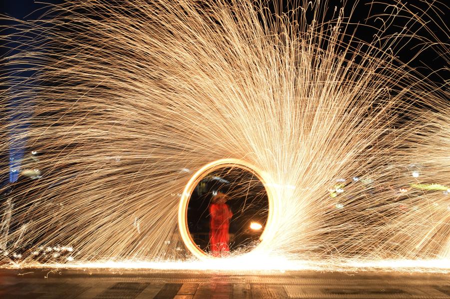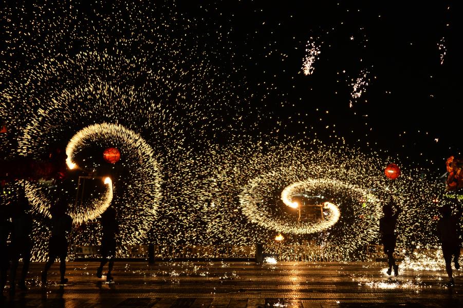 Des gens admirent des "fleurs de fer", un spectacle d'art folklorique qui consiste à lancer du fer fondu pour créer des effets de feu d'artifice, à Changsha, capitale de la province chinoise du Hunan (centre), le 26 février 2021. (Photo : Chen Zhenhai)