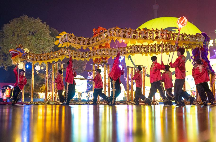 Des employés exécutent la danse du dragon au parc d'attractions Happy Valley Wuhan, à Wuhan, capitale de la province chinoise du Hubei (centre), le 26 février 2021. (Photo : Xiong Qi)