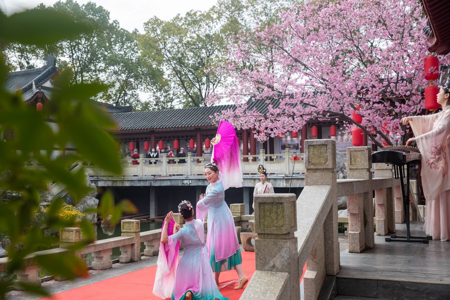 Des actrices dansent au parc des fleurs de cerisier du lac de l'Est à Wuhan, dans la province chinoise du Hubei (centre), le 27 février 2021. (Photo : Ke Hao)