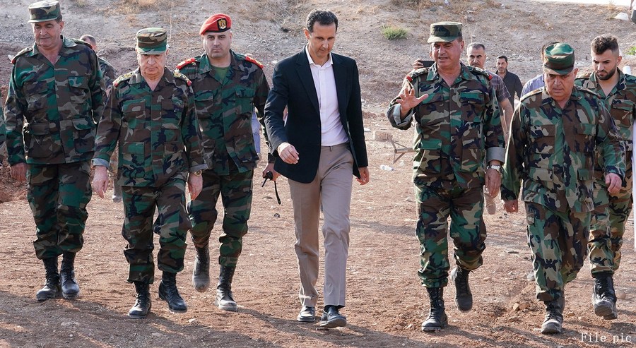 Le président syrien Bachar el-Assad (au centre) rencontre des soldats syriens dans un camps militaire dans la localité d'Al-Habit, dans la province syrienne d'Idleb (nord-ouest), le 22 octobre 2019. (Présidence syrienne via Xinhua)