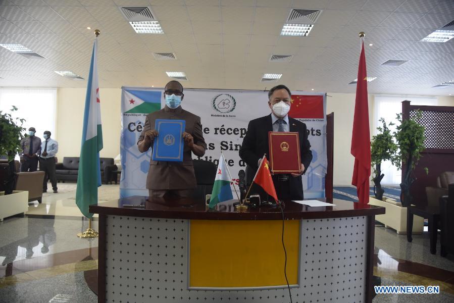 Le ministre djiboutien de la Santé, Mohamed Warsama Dirieh (G) et l'ambassadeur de Chine à Djibouti, Zhuo Ruisheng (Xinhua)